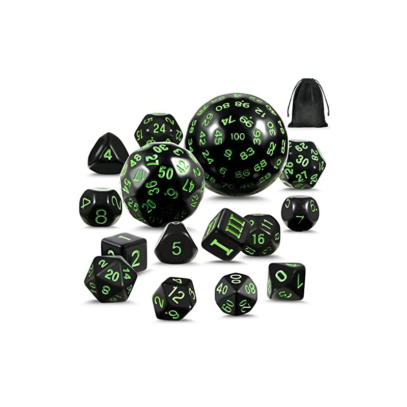 DNDND D100 Dice15 Pieces Polyhedral DND Dice D3-D100 with Velvet Pouch for DND Tabletop Game(Black with Green Number)