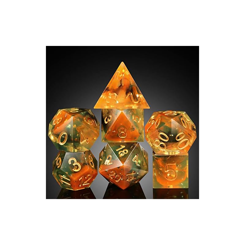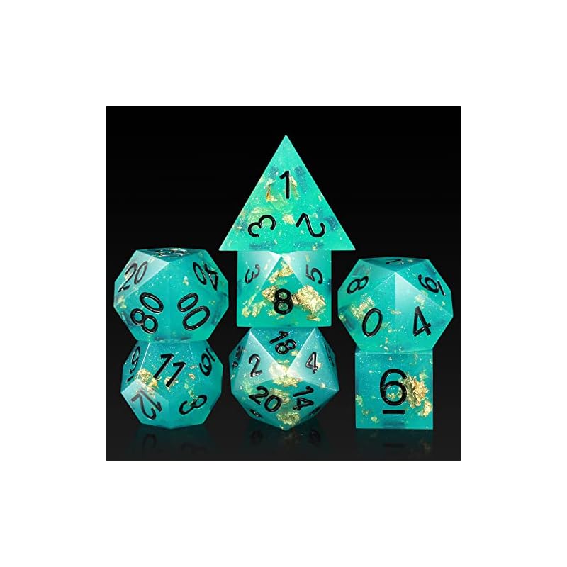 DND Sharp Dice DNDND Resin Sharp Edge 7 D&D Die with Gorgeous Gift Case for Dungeons and Dragons (Green and Tranlucent with Gold Number)